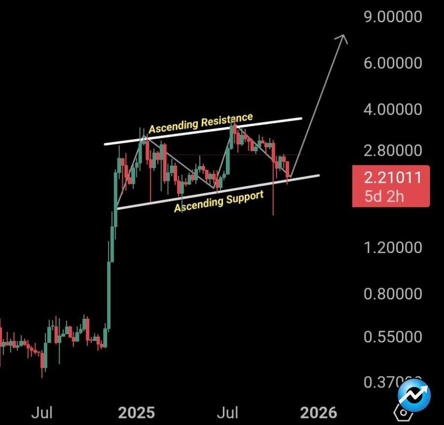 نمودار XRP نشان میدهد که قیمت در یک کانال صعودی حرکت میکند و پس از رسیدن به خط روند پایینی، با واکنش خریداران دوباره بالا آمده است. این ناحیه چندین بار بهعنوان حمایت عمل کرده و همچنان اعتبار دارد.