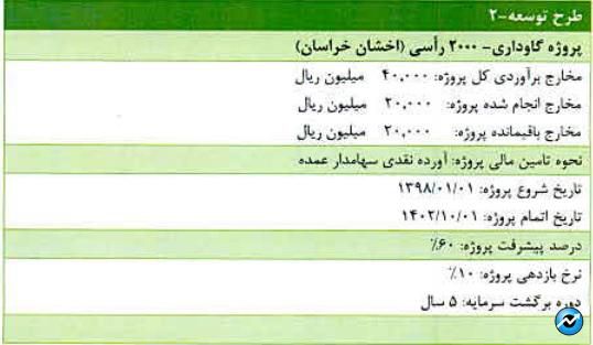 شرکت اخشان خراسان دارای دو واحد گاوداری در استان خراسان رضوی است. در چناران در زمینی به مساحت ۳۰ هزار متر مربع و در شهرستان قوچان در زمینی به مساحت ۲۰۰۰ متر مربع و ۶۱ راس گاو نژاد هلشتاین است. جمعا شرکت دارای ۱۰۱۴ راس گاو از نژاد هلشتاین و متوسط شیر تولیدی ۱۲.۳ هزار کیلوگرم در روز است.