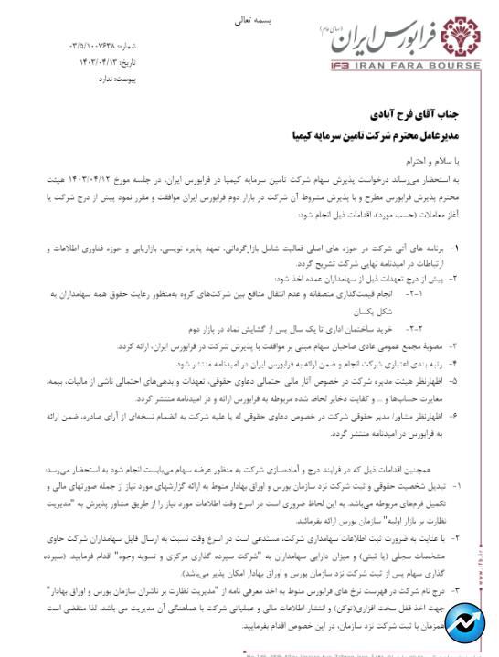 بر این اساس، این شرکت اعلام کرد، هیئت پذیرش فرابورس با پذیرش مشروط شرکت تامین سرمایه کیمیا (سهامی عام) در بازار دوم فرابورس ایران طبق جلسه مورخ ۱۴۰۳/۰۴/۱۲ موافقت شده است.