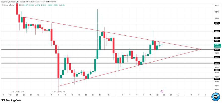 اکنون اگر این روند ادامه یابد، احتمال شکستن مثلث و رسیدن قیمت پای کوین به سطوح ۰.۲۵۰، ۰.۲۶۰ و حتی ۰.۲۷۲ دلار وجود دارد.